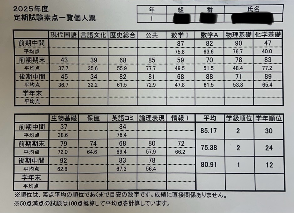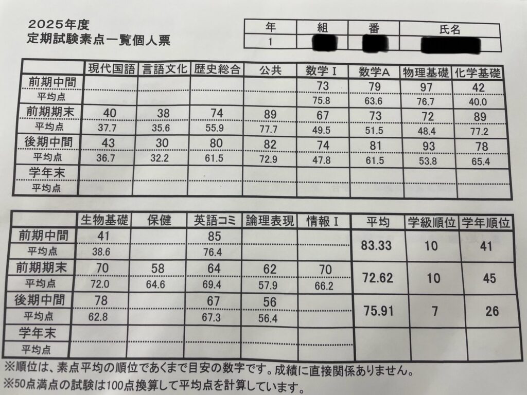 県立相模原高校の1年生が定期試験素点一覧個人票を持参してくれました。